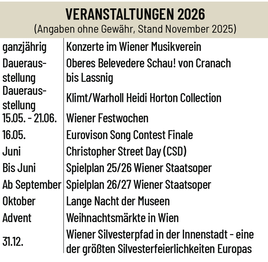 Es gibt viel zu sehen: Vom gotischen Stephansdom über die imperiale Hofburg bis zum prächtigen Barockschloss Schönbrunn bietet Wien insgesamt über 27 Schlösser und mehr als 150 Palais. Zudem laden die Altstadt und bekannte Einkaufsstraßen zum Bummeln ein und für einen Besuch im Kaffeehaus mit einem köstlichen Stück Sachertorte bleibt bei unserer fünftägigen Reise sicher auch genügend Zeit.