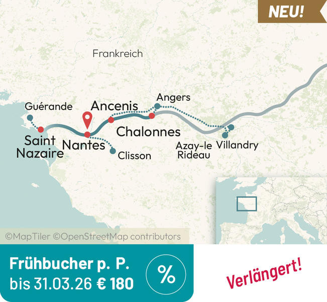 Nachdem Sie sich am Frühstücksbuffet gestärkt haben, unternehmen Sie mit Ihrem Reisebus einen Ausflug über La Baule nach Guérande. In der kleinen mittelalterlichen Stadt dreht sich seit jeher alles um das „Weiße Gold", das in den Salzgärten des Atlantiks gewonnen wird. Schlendern Sie durch den historischen Stadtkern mit seinen kleinen Gassen, verzierten Steinhäusern und Geschäften, in denen das Guérandesalz allgegenwärtig ist, spazieren Sie über die Stadtmauer oder statten Sie der Stiftskirche St. Aubin einen Besuch ab. Zum Mittagessen kommen Sie zurück an Bord. Genießen Sie am Nachmittag die Ausblicke auf die vorbeiziehende Landschaft, wenn Ihr Schiff Richtung Nantes kreuzt. Während des Abendessens erreichen wir Nantes.