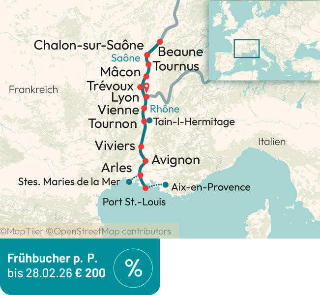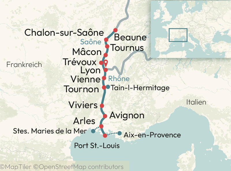 Erleben Sie zwei unvergessliche Wochen auf den Flüssen im Süden Frankreichs: Sie lernen nicht nur charmante Städte kennen, sondern erleben außerdem tolle Landschaften, wie die Camargue, die Provence und die Weinberge des Burgunds. Lassen Sie sich von Frankreich verzaubern! Lyon – Chalon-sur-Saône – Tournus – Mâcon – Trévoux – Viviers – Port-St.-Louis – Arles – Avignon – Tournon – Vienne – Lyon