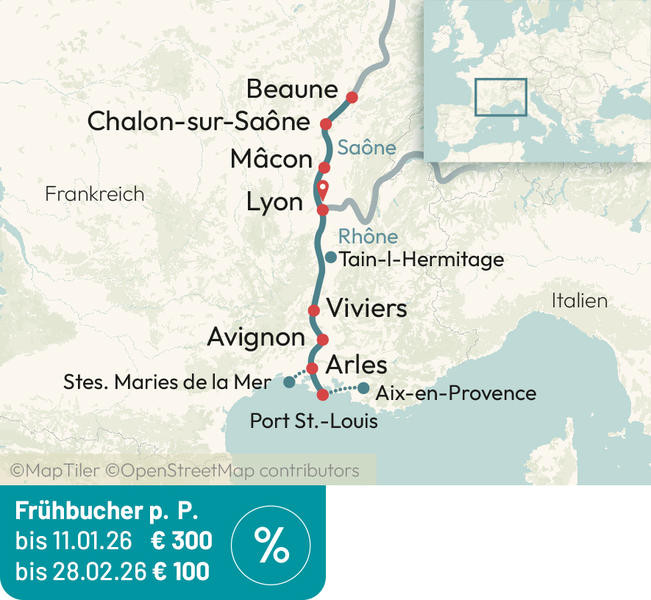 Leichtigkeit, Genuss, Lebensfreude.Nirgends werden Sie das Lebensgefühl der Franzosen besser verstehen als auf einer Reise durch die charmantesten Städte Frankreichs wie Lyon, Arles und natürlich Avignon mit dem berühmten Papstpalast. Weltbekannte Weinanbaugebiete, einzigartige Landschaften und Kulturschätze stehen außerdem auf dem Programm. Lyon – Chalon-sur-Saône – Mâcon – Lyon – Viviers –Arles – Port-Saint-Louis –Avignon – Tain l'Hermitage– Lyon