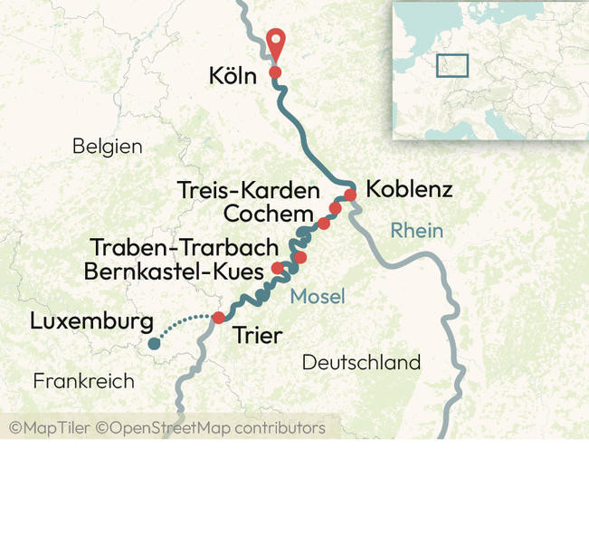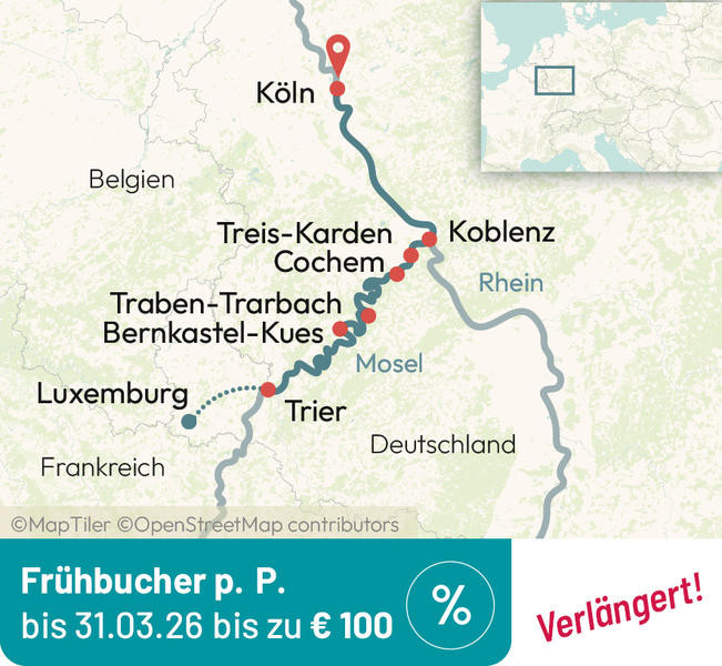 Von Köln aus entdecken Sie das Schönste von der Mosel: Malerische historische Städte entlang eines lieblichen Flusses. Genießen Sie in einem der schönsten Weingebiete, den wohlschmeckenden Moselwein. Die malerischen Burgen und Schlösser sind gewiss ein postkartenreifer Anblick. Köln – Treis-Karden – Bernkastel-Kues – Trier/Luxemburg – Traben-Trarbach – Cochem – Koblenz – Köln