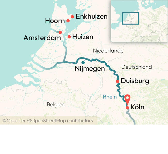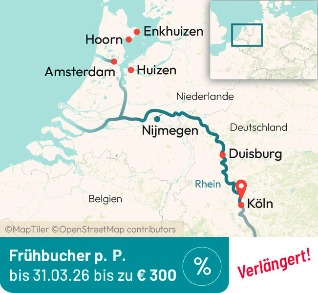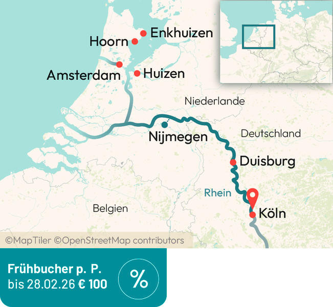 Urlaubsfeeling auf dem Ijsselmeer. Romatische Fischerdörfer Hoorn und Enkhuizen und die Weltstadt Amsterdam. Erleben Sie auf dieser Kreuzfahrt die Vielfalt des nördlichen Rheins. Köln – Lelystad/Amsterdam – Huizen – Enkhuizen – Hoorn – Nijmegen – Duisburg – Köln