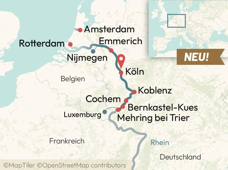 Erleben Sie die atemberaubende Schönheit gleich zweier Flüsse auf unserer umfassenden Panoramakreuzfahrt. Köln – Cochem – Mehring bei Trier – Bernkastel-Kues – Koblenz – Nijmegen – Amsterdam – Rotterdam – Emmerich – Köln