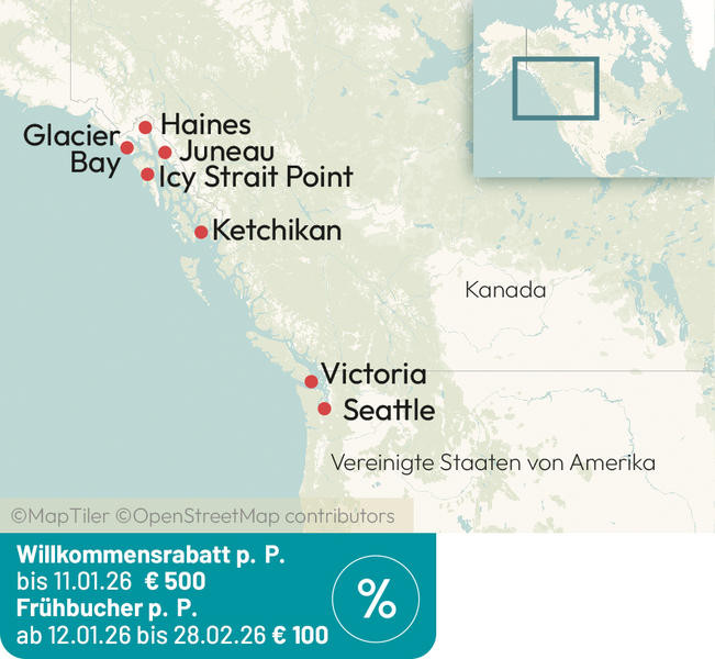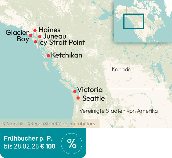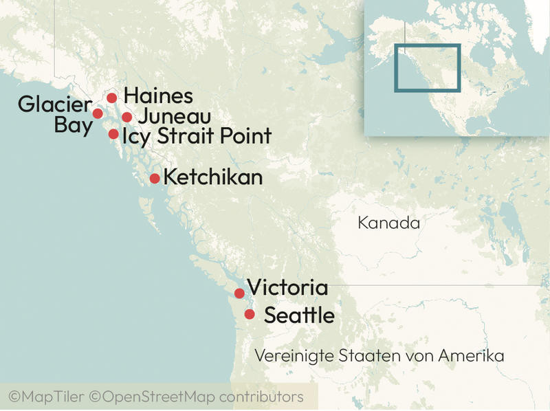 Erleben Sie Alaska in seiner ganzen Pracht – majestätische Gletscher, glitzernde Fjorde und unberührte Natur. Ihre Reise beginnt in Seattle, wo Sie die Highlights der Stadt entdecken, vom Pike Place Market bis zur Space Needle.An Bord der eleganten Queen Elizabeth genießen Sie kulinarische Vielfalt, stilvolle Unterhaltung und mit etwas Glück die Beobachtung von Walen. Höhepunkte der Kreuzfahrt sind Ketchikan, Haines, der Mendenhall-Gletscher in Juneau und die spektakuläre Fahrt durch den Glacier Bay National Park. Abgerundet wird Ihre Reise mit einem Besuch der charmanten kanadischen Stadt Victoria.Eine perfekte Mischung aus Stadterlebnissen, Naturwundern und Komfort an Bord – für unvergessliche Momente von der Metropole bis zu Alaskas Wildnis. wird Ihre Reise mit einem Besuch der charmanten kanadischen Stadt Victoria.Eine perfekte Mischung aus Stadterlebnissen, Naturwundern und Komfort an Bord – für unvergessliche Momente von der Metropole bis zu Alaskas Wildnis.
