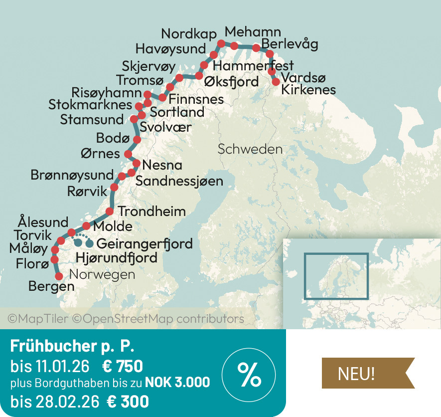 Auf dieser klassischen Seereise mit den Hurtigruten ab Bergen erleben Sie die Höhepunkte der norwegischen Küste und das Nordkap. Wilde Natur, beeindruckende Fjorde und Berge, dass unbeschreibliche Licht der Lofoten sorgen für unvergessliche Momente auf dieser Seereise. Die besondere Gastfreundschaft auf der MS Kong Harald machen diese Reise zu einem besonderen Erlebnis. Bergen – Ålesund / Geiranger- oder Hørundfjord– Trondheim – Bodø – Tromsø – Nordkap – Kirkenes – Vesterålen und Lofoten – Brønnøysund – Trondheim – Molde – Bergen