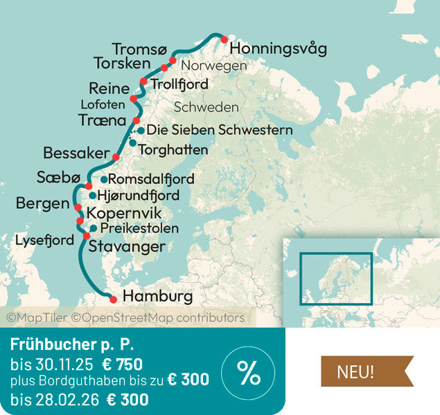 Auf dieser Signature Reise mit den Hurtigruten ab Hamburg erleben Sie die Höhepunkte der norwegischen Küste und das Nordkap. Wilde Natur, beeindruckende Fjorde und Berge, das unbeschreibliche Licht der Lofoten sorgen für unvergessliche Momente auf dieser Seereise. Lange Liegezeiten in den Häfen und die besondere Gastfreundschaft auf der MS Finnmarken machen diese Reise zu einem besonderen Erlebnis. Hamburg – Bergen – Stavanger und Lysefjord – Træna – Senja – Nordkap – Tromsø – Reine/Lofoten – Bessaker – Sæbø/Hjørundfjord – Haugaland – Hamburg