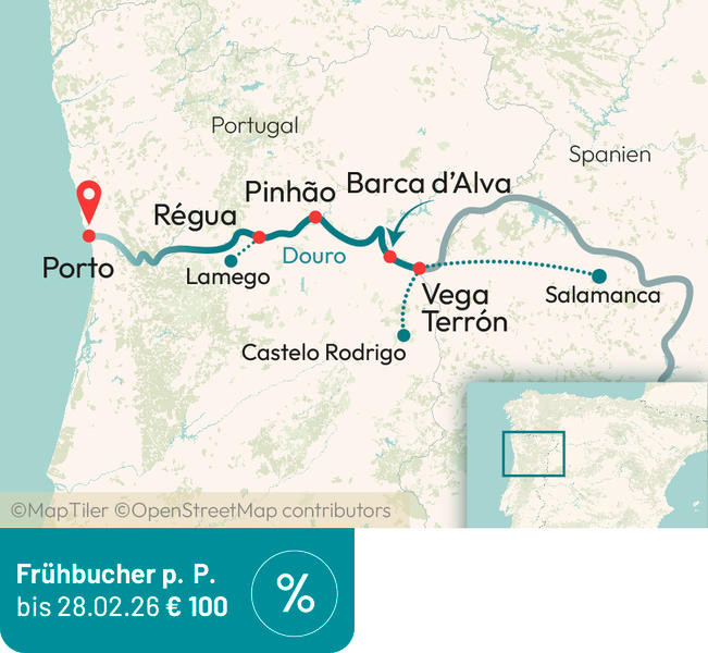 Erleben Sie portugiesische Lebensart pur bei der Fahrt auf der A-ROSA ALVA. Die Hafenstadt Porto ist nicht nur Start- und Endpunkt der Reise, sondern zugleich auch ein Highlight der Reise, die durch eine Landschaft führt, die so schön ist, dass keine Postkarte ihr gerecht wird. Porto – Pinhão – Barca d‘Alva – Vega de Terrón – Pinhão – Leverinho – Porto