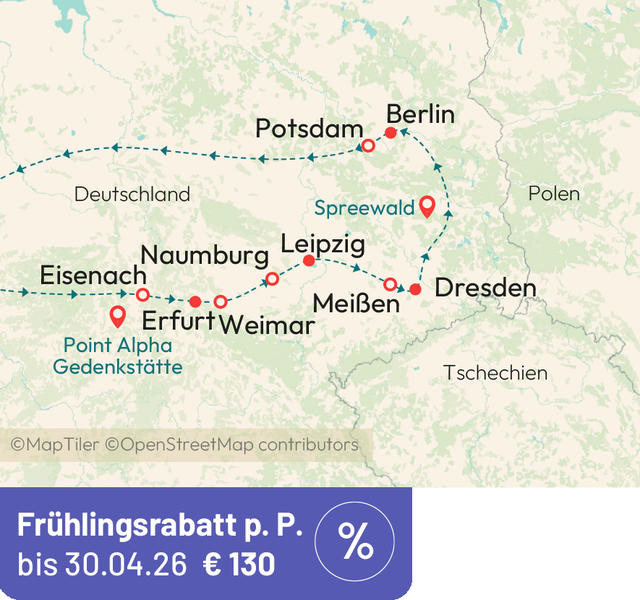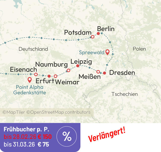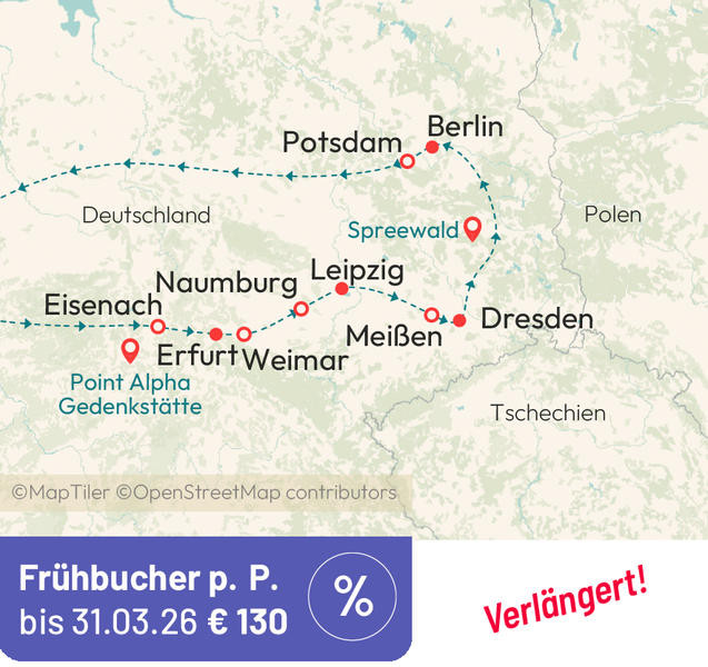 Unternehmen Sie mit uns eine spannende Rundreise durch Thüringen, Sachsen, Sachsen-Anhalt, Brandenburg und Berlin.