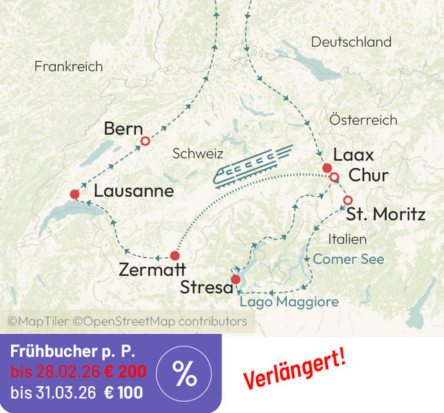 Entdecken Sie die Schweiz! Das berühmte Lugano im Tessin, der bekannte Urlaubsort Zermatt, Lausanne mit seinen zahlreichen Straßencafés und als Höhepunkt der Reise die Fahrt im Panoramawagen des Glacier Express – die landschaftlich wohl schönste Eisenbahnstrecke der Welt.