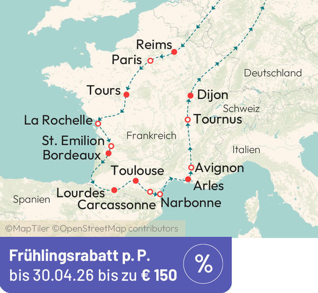 Stadtbesichtigungen in Reims, Tours, Bordeaux, Toulouse, Carcassone, Arles und Dijon