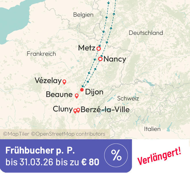 Nach dem Frühstück treten wir die Heimreise an. Ein Zwischenstopp in Nancy, der „Schönen Lothringerin", bietet Gelegenheit, die eleganten Plätze und die mittelalterliche Altstadt zu genießen. Abends Rückkehr zum Zustiegsort.