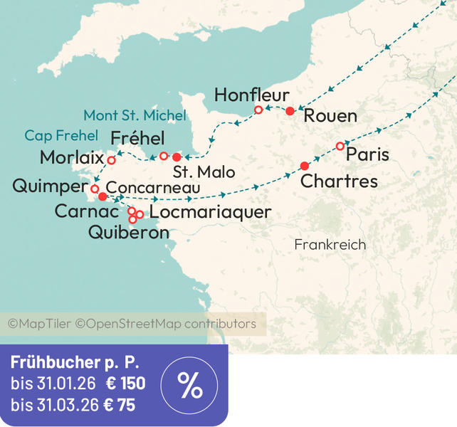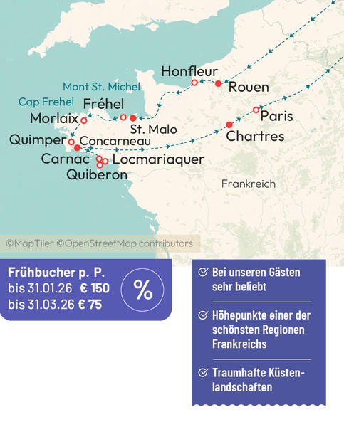 Die Normandie, das Land des Calvados und des Camenbert, idyllischen, abwechslungsreichen Landschaften und vielen historisch bedeutenden Sehenswürdigkeiten sowie die Bretagne mit ihren verschlafenen Fischerdörfern, einsamen Heide- und Moorgebieten – eine Landschaft voller Legenden. Zwei Regionen Frankreichs, die Sie beeindrucken werden.