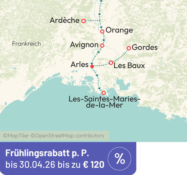 Die Provence und die Camargue laden zum Genießen ein: Kaum eine Region Frankreichs hat eine so vielfältige Landschaft zu bieten. Erleben Sie den Duft der Lavendelfelder, die malerischen Dörfer auf den Bergrücken der Alpilles, einsame Täler in der Vaucluse. Schon die Römer liebten das Leben in der Provence und hinterließen eine Fülle von Baudenkmälern. Im Mittelalter residierten Päpste in Avignon, siedelten Mönche in einsamen Tälern und die Adelsgeschlechter bauten stolze Burgen, die bis heute erhalten sind.