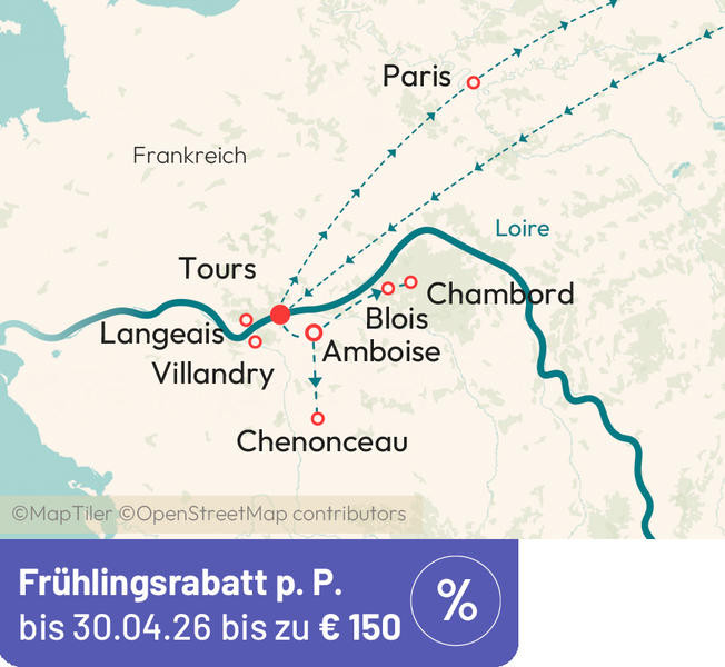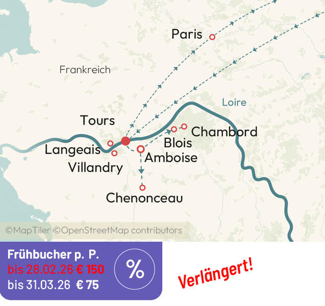 Die Stadt Tours ist vor allem für ihre Verbindung zum Heiligen Martin bekannt, der im Jahre 397 in Tours starb. Seine guten Taten werden auch heute noch jedes Jahr mit großen Martinszügen geehrt. Bei unserer Stadtführung am heutigen Vormittag besichtigen wir die Basilika des Hl. Martin, die um die Jahrhundertwende erbaut wurde und in ihrer Krypta den Sarg des St. Martin beherbergt. Auch der Kathedrale Saint Gatien statten wir einen Besuch ab. Das zwischen dem 12. und 16. Jhd. errichtete Gotteshaus ist ein Kleinod der gotischen Architektur in Frankreich und war im Mittelalter ein berühmtes Wallfahrtszentrum. Der Rest des Tages steht Ihnen für eigene Besichtigungen zur freien Verfügung. Unser Reiseleiter gibt Ihnen gerne Tipps zur weiteren Gestaltung des Tages.