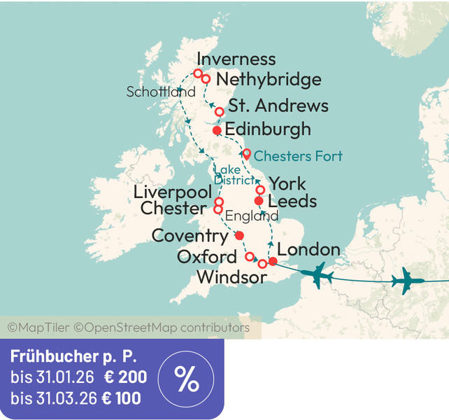 Entlang des berühmten Loch Ness beginnen wir unseren Tagesausflug durch das schottische Hochland. Als die letzte große Wildnis Westeuropas bieten die „Highlands" Ihnen atemberaubende landschaftliche Eindrücke. Unsere Fahrt führt uns durch die legendenhafte Seenplatte des nordwestlichen Hochlands und die schönsten Landschaftszüge Schottlands – ganz sicher werden Sie die Sagen und Legenden der Hochland-Clans in eine längst vergessene Zeit entführen. Freuen Sie sich auch auf den Besuch der Hauptstadt der Highlands – Inverness.
