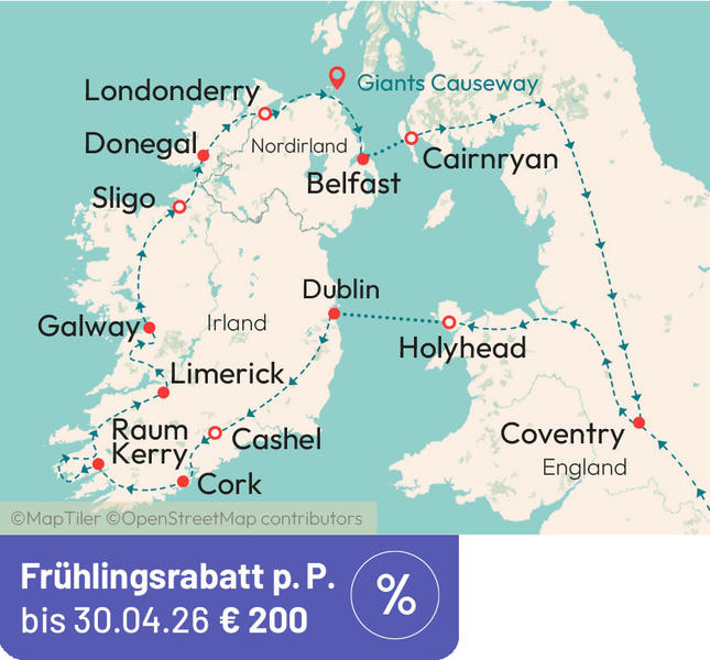 Irland - die grüne Insel voller Magie. Erleben Sie die Schönheit der Republik Irland: saftig grüne Hügel, schroffe Klippen und lebendige Städte. Entdecken Sie Dublin, den Ring of Kerry und die Cliffs of Moher – und lassen Sie sich von irischer Gastfreundschaft, Musik und Mythen verzaubern.