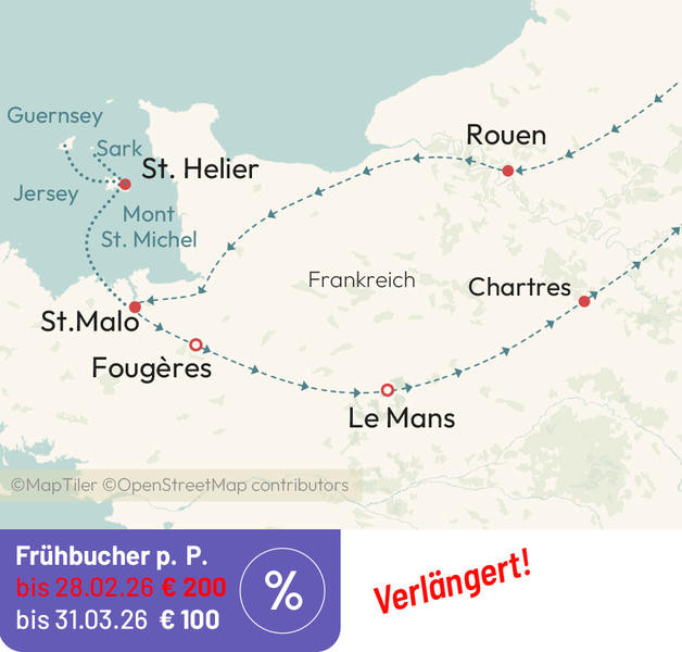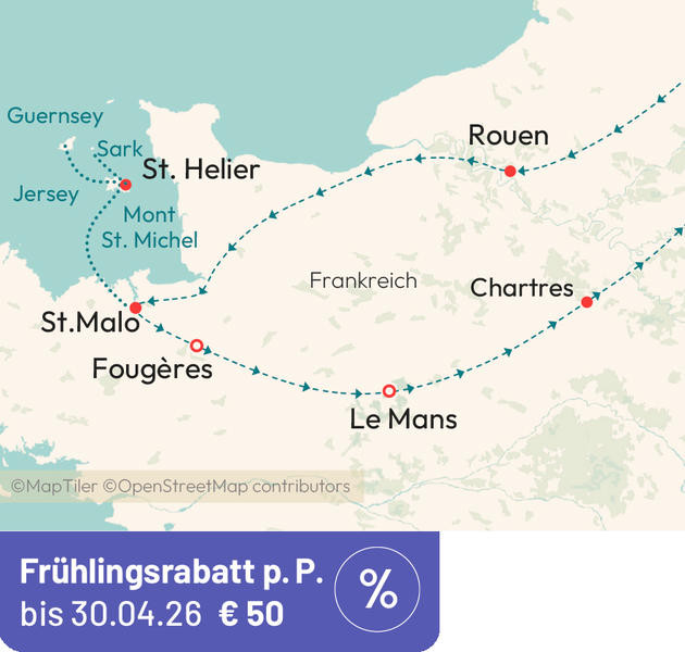 Die vom warmen Golfstrom verwöhnten Inselparadiese vor der französischen Küste sind gleichermaßen britisch wie französisch beeinflusst. Seit 700 Jahren sind die Kanalinseln mit Privilegien relativer Unabhängigkeit vom Königreich England gesegnet und noch heute zeugen alte Gutshöfe, Wehrtürme und Burgen von einer 6.000 Jahre zurückreichenden Siedlungsgeschichte.