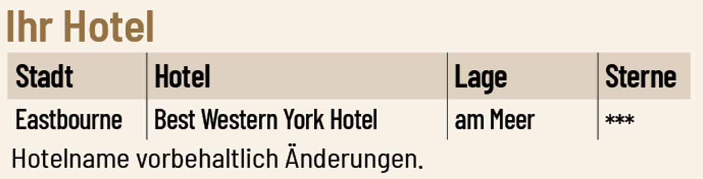 Hotel: Das im eleganten viktorianischen Stil erbaute Hotel liegt nur wenige Meter vom Eastbourne Pier und ca. 10 Gehminuten vom Stadtzentrum entfernt. Adresse: 14-22 Royal Parade, Eastbourne, East Sussex, BN22 7AP.