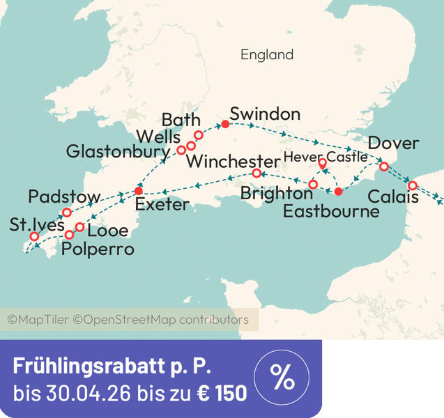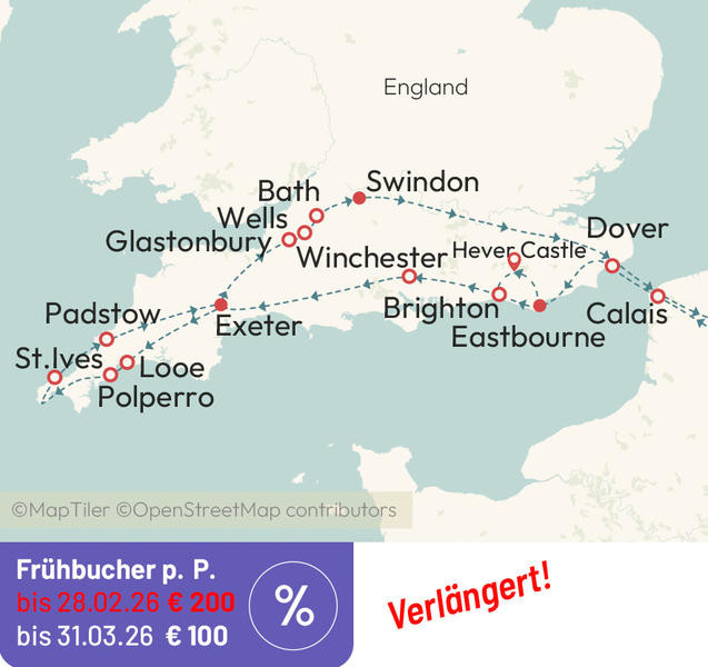 Entdecken Sie die ständig wechselnden Landschaftszüge des englischen Südens. Die paradiesischen Gärten Kents und Sussex’ werden Sie ebenso wie die Burgen und Schlösser dieser Region verzaubern. Die von Hügelketten durchzogene Landschaft Südwestenglands empfängt Sie mit einer Vielfalt architektonisch interessanter Städte und in Cornwall wandeln Sie auf den Spuren von Rosamunde Pilcher.