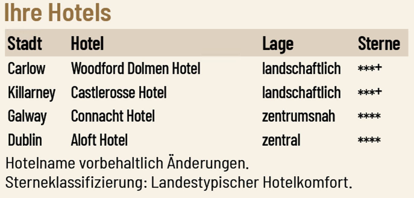 Je nach Flugzeit Abholung vor Ihrer Haustür (gem. Abholservice) und Transfer zum Flughafen. Flug nach Dublin. Per Transfer geht es zum Hotel nach Carlow. Vor dem Abendessen lernen Sie Ihre Reiseleitung kennen.