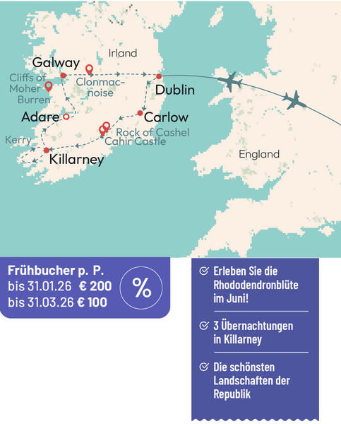 „Das ist die Pracht, welche sich die Natur allein vorbehalten hat ...", so erschien Fürst Pückler dieses herrliche Fleckchen Erde. Das Landschaftsbild der Insel wird geprägt von endlosen Mooren, saftigen Wiesen, sagenumwobenen Burgen, steilen Felsküsten, frühchristlichen Klosteranlagen und einer Artenvielfalt mediterraner Pflanzen. Kurzum, Irland ist ein elementares Naturerlebnis.