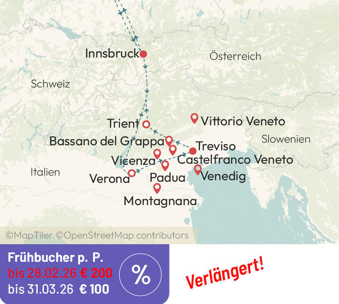 Die Weiterreise erfolgt über Verona, die Stadt die für immer mit der tragischen Liebesgeschichte „Romeo und Julia" verbunden ist - Stadtbesichtigung. Am späten Nachmittag Hoteleinweisung in Treviso.