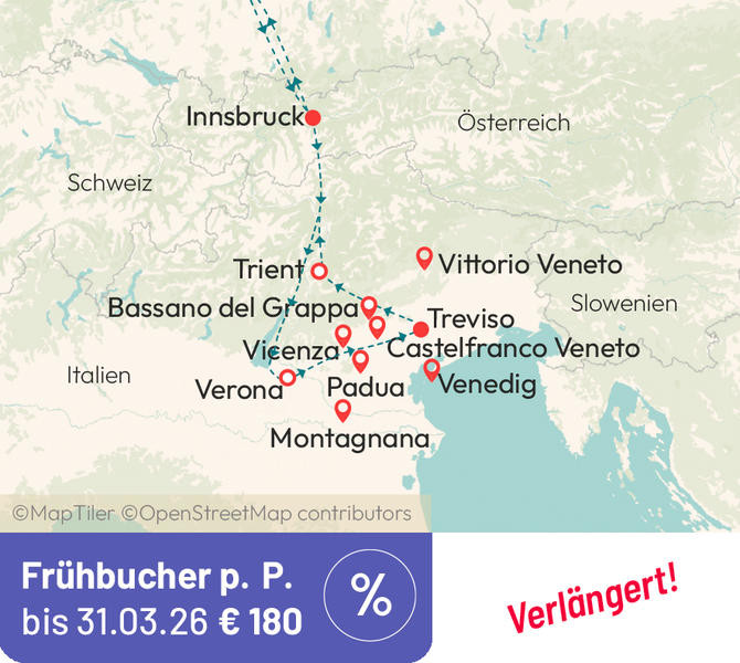 Lieben Sie bildschöne Naturpanoramen, charmante Orte und leckeres Essen weitab des Massentourismus? Dann ist das Veneto das Reiseziel für Sie. Der „Garten Venedigs", wie diese Region genannt wird, ist reich an fruchtbaren Weinbergen, blühenden Gemüsefeldern, malerischen Flusslandschaften, üppigen Wäldern und pittoresken Städtchen. Sie wohnen in Treviso, eine wahre Kunststadt mit stimmungsvollen Plätzen und stilvollen Gebäuden. Eine echte Attraktion ist die Villa Emo, ein Kunststück Andrea Palladios, und der weinrote Radicchio, dem zu Ehren jeden Winter mehrere Feste gefeiert werden. Abgerundet wird all dies mit dem berühmten Prosecco aus Valdobbiadene.