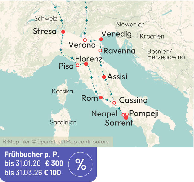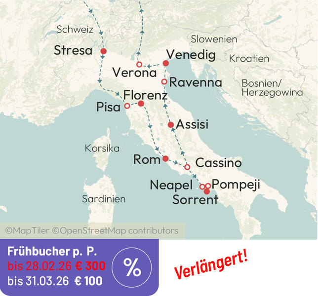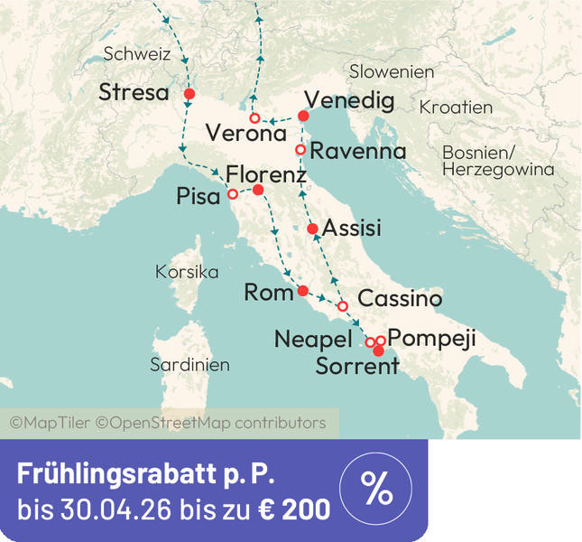 Italien – das bedeutet herrliche Landschaft, berühmte Baudenkmäler, einzigartige Kunst- und Kulturstädte wie Florenz, Rom oder Verona als pulsierende Metropolen. Bewundern Sie auf dieser Reise ein Kaleidoskop von prachtvollen Reichtümern längst vergangener Zeiten, und genießen Sie die großartige Schönheit der Amalfi-Küste, die zu den bezauberndsten Küstenstreifen der Welt zählt.