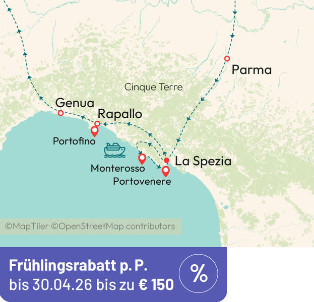 Nach dem Frühstück verlassen wir La Spezia und erreichen nach kurzer Fahrt Portovenere, eine charakteristische mittelalterliche Küstenstadt, die auf einer felsigen Halbinsel in römischer Zeit erbaut wurde. Die „romantische" Stadt bezaubert vor allem durch ihre verwinkelten Gassen, die bunten Häuser und Türme, die das Stadtbild prägen. Mittags Rückfahrt mit dem Schiff entlang der ligurischen Küste nach La Spezia. Der Rest des Tages steht Ihnen zur freien Verfügung.
