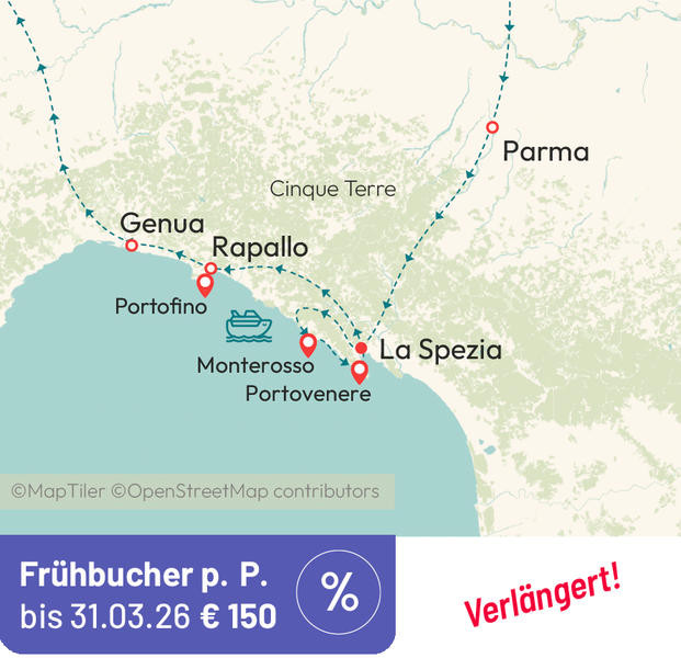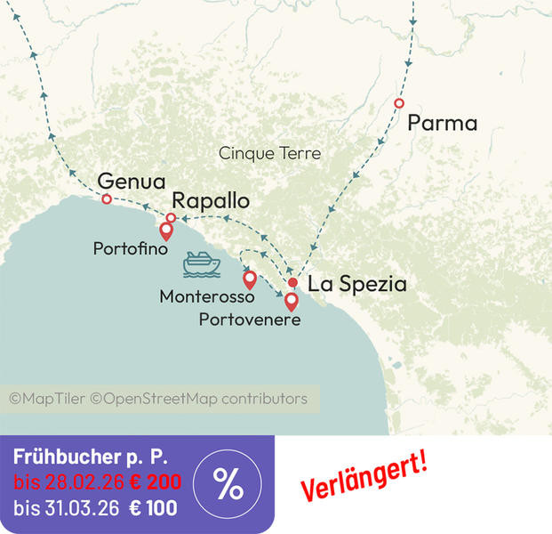 „Cinque Terre" bedeutet „fünf Dörfer" (UNESCO-Weltkulturerbe). Die Orte Monterosso, Vernazza, Corniglia, Manarola und Riomaggiore im äußersten Südosten der ligurischen Riviera verteilen sich auf einen Küstenstreifen von nur 9 km Länge. Bei Ihrem heutigen Ausflug in die Cinque Terre erleben Sie eine herrliche Landschaft, die bis heute ihre Unberührtheit bewahrt hat, wobei ihr eine raue und ungebändigte Natur zur Hilfe kam. Die Schönheit der Cinque Terre besteht im heftigen Kontrast zwischen Meer und den steil abfallenden Felsen. Unser heutiger Zug-/Schiffsausflug entführt Sie in diese eindrucksvolle Küstenlandschaft.