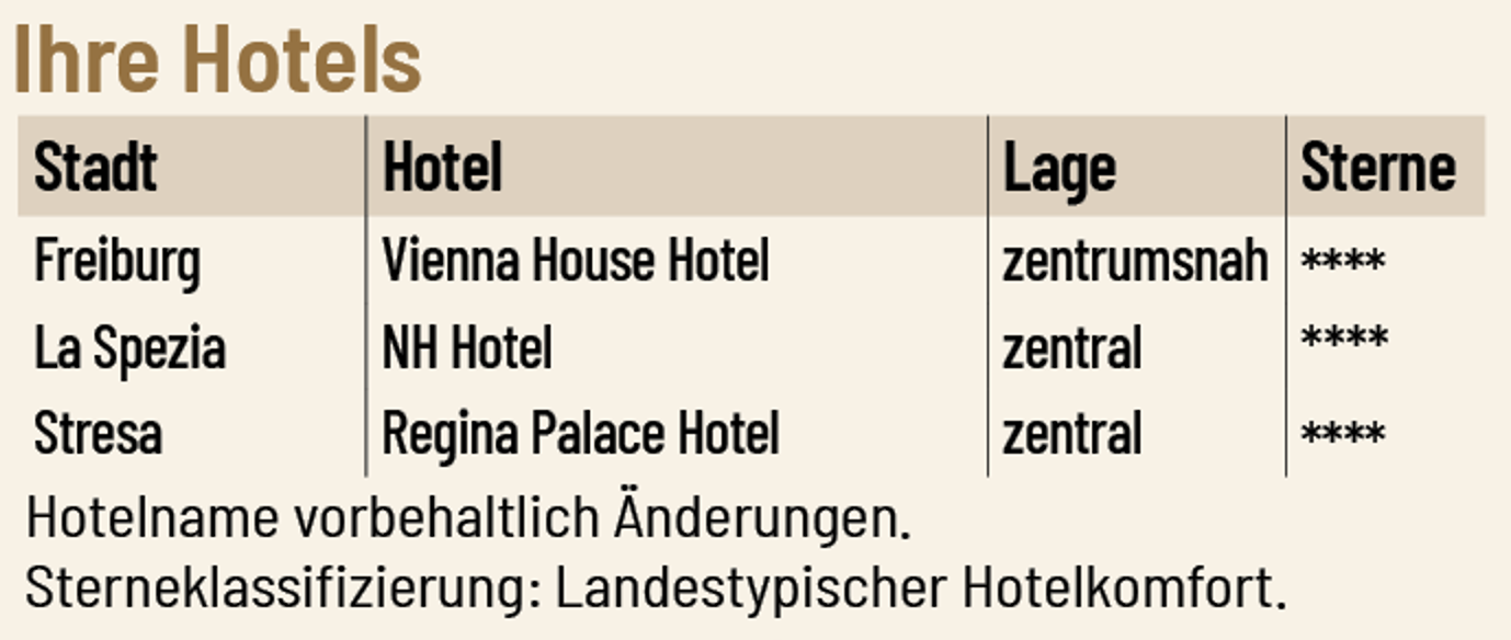 Heute treten wir nach dem Frühstück die Rückreise Richtung Lago Maggiore an. Mittags erreichen wir Genua. Die Prachtstraße La Strade Nuove und der Palazzi dei Rolli wurden zum UNESCO-Weltkulturerbe ernannt – panoramische Stadtbesichtigung. Weiterfahrt nach Stresa am Lago Maggiore, wo sich Ihr Domizil für die letzte Übernachtung befindet.