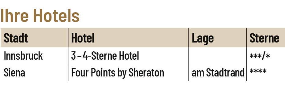 Heute verlassen wir Innsbruck und erreichen die Stadt Modena – Spaziergang. Modena ist nicht nur wegen seiner historischen Bedeutung bekannt, sondern auch als Zentrum des Balsamico-Essigs. Weiterfahrt in den Raum Siena.