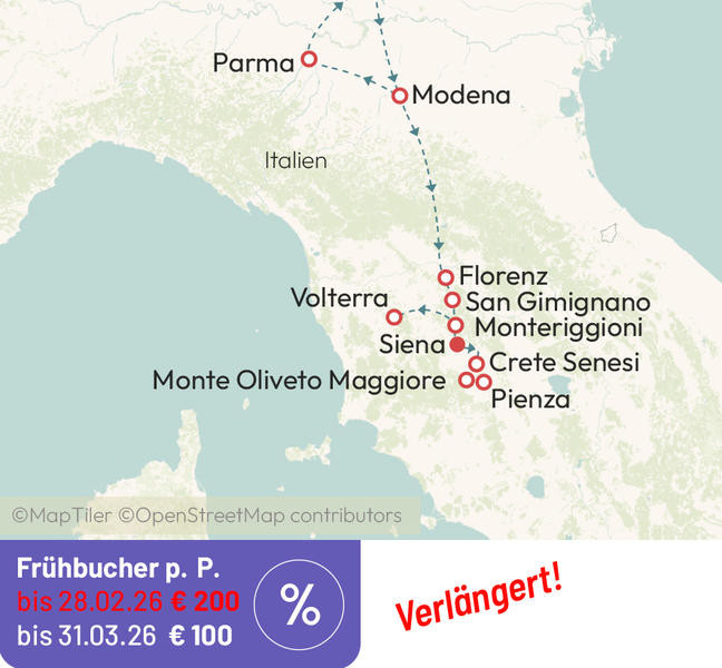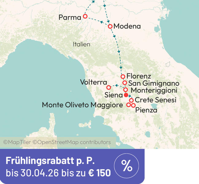 Diese Reise ist ein Gaumenschmaus! Neben den Städten Siena, Volterra, Florenz & Pisa entdecken wir allerlei Köstlichkeiten: Wein im Chianti, Balsamico-Essig, Olivenöl u.v.m.