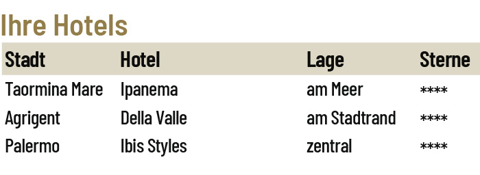 Bewundern Sie Sizilien mit seiner Schönheit, Anmut und Herzlichkeit. Dem Besucher eröffnet sich eine Welt mit einem prächtigen und unverwechselbaren Zauber. Erleben Sie im Land der Kunst und Musik die Zeugen einer glanzvollen Vergangenheit.