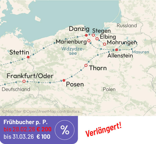Seiner Lage an der Mündung der Weichsel in die Ostsee verdankt Gdansk seinen strategischen Stellenwert. Es ist die Heimat von Lech Walesa und Solidarnosc, aber ebenso interessant wie die politische Bedeutsamkeit ist das kulturelle Leben der Stadt. Mit dieser Reise bieten wir Ihnen die Möglichkeit den Norden Polens von Danzig sowie das Gebiet der Masuren von Allenstein aus kennen zu lernen.