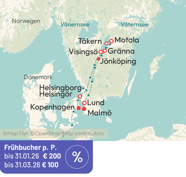 Erleben Sie heute die kleine Großstadt Jönköping bei einer Stadtrundfahrt. Einst war der Name der Stadt bekannt für die Herstellung von Zündhölzern. Im Streichholzmuseum wird diese Geschichte wieder lebendig. Ein Besuch des Schmiededorfes mit seinen Handwerkern und einer Galerie runden die Stadtrundfahrt ab. Der Nachmittag steht Ihnen zur freien Verfügung. Freuen Sie sich am Abend auf leckeres Essen im Hotel.
