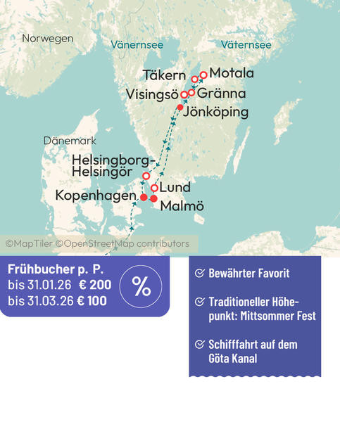 Erleben Sie Schweden von seiner natürlichen Seite. Kleine Orte, verträumte Seen und eine Landschaft zum Verlieben. Freuen Sie sich als Höhepunkt Ihrer Reise auf das Mittsommernachtsfest an dem Sie teilhaben werden – ganz wie im Film.