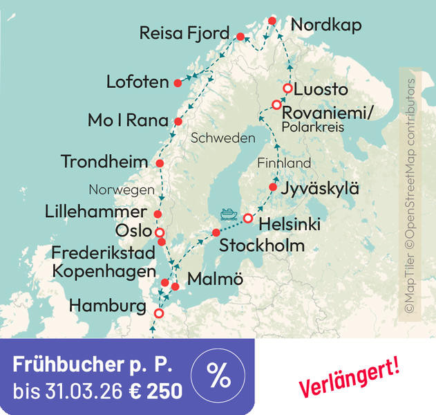 Eine Traumreise in den hohen Nordens Europa erwartet Sie auf unserer neuen Route zum Nordkap. Erleben Sie eine außergewöhnliche Kombination mit Bus und Schiff. Auf den schönsten Straßen Skandinaviens erreichen Sie das Nordkap und erleben die unberührte Wildnis von Lappland. Mit dem Schiff fahren Sie durch die zauberhaften Schären der Ostsee. Auf der atemberaubenden Küstenstraße erleben Sie mit den Fjorden und den Inseln der Lofoten die Highlights der norwegischen Küste. Die Perlen der Skandinavischen Hauptstädte Stockholm, Helsinki und Oslo erleben Sie auf Ihrer Entdeckerreise hautnah.