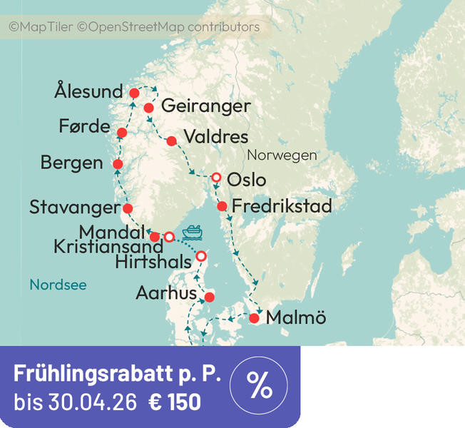 Traumhafte Welten – hohe Berge, tiefe Fjorde, auf Traumstraßen durch eine der schönsten Landschaften Europas. Neben den Naturschönheiten erleben Sie die alte Wikingergeschichte. Oslo ist der Ort für das neue moderne Norwegen. Kultur und Natur auf einer Sehnsuchtsreise im hohen Norden.