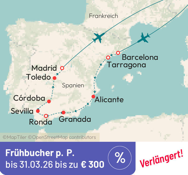 Entlang der Costa del Garraf führt die Reise in die historisch bedeutsame Stadt Tarragona. Wir besichtigen die Altstadt und genießen dann den wundervollen Ausblick vom „Balkon des Mittelmeers". Anschließend Weiterfahrt nach Alicante.
