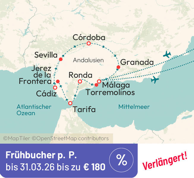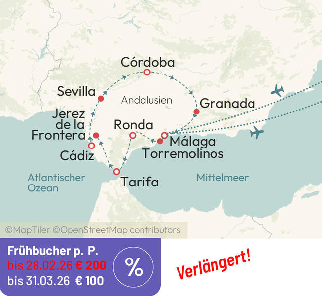 Entdecken Sie den spanischen Süden und lassen Sie sich vom orientalischen Flair dieser Region verzaubern. Jahrhundertelang herrschten die Mauren über Andalusien und hinterließen ihre Spuren. Erst die Reconquista zerstörte die erste islamische Hochblüte und brachte das Christentum nach Spanien zurück. Dennoch zeugen auch heute noch wunderschöne Gärten, imposante Festungsanlagen oder uralte Städte von dieser kulturellen Vermischung.