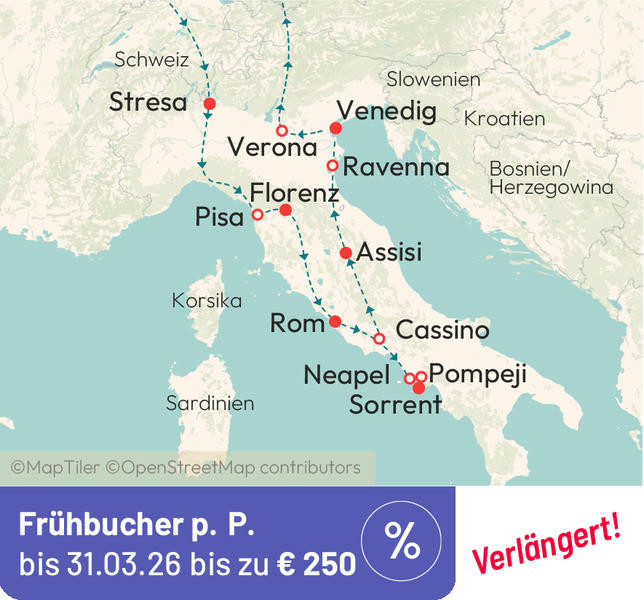Italien – das bedeutet herrliche Landschaft, berühmte Baudenkmäler, einzigartige Kunst- und Kulturstädte wie Florenz, Rom oder Verona als pulsierende Metropolen. Bewundern Sie auf dieser Reise ein Kaleidoskop von prachtvollen Reichtümern längst vergangener Zeiten, und genießen Sie die großartige Schönheit der Amalfi-Küste, die zu den bezauberndsten Küstenstreifen der Welt zählt.