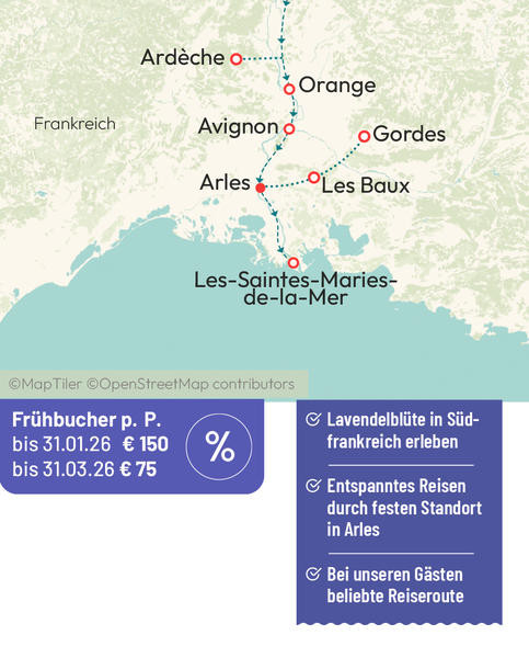 Die Provence und die Camargue laden zum Genießen ein: Kaum eine Region Frankreichs hat eine so vielfältige Landschaft zu bieten. Erleben Sie den Duft der Lavendelfelder, die malerischen Dörfer auf den Bergrücken der Alpilles, einsame Täler in der Vaucluse. Schon die Römer liebten das Leben in der Provence und hinterließen eine Fülle von Baudenkmälern. Im Mittelalter residier­ten Päpste in Avignon, sie­delten Mönche in einsamen Tälern und die Adels­geschlechter bauten stolze Burgen, die bis heute erhalten sind.