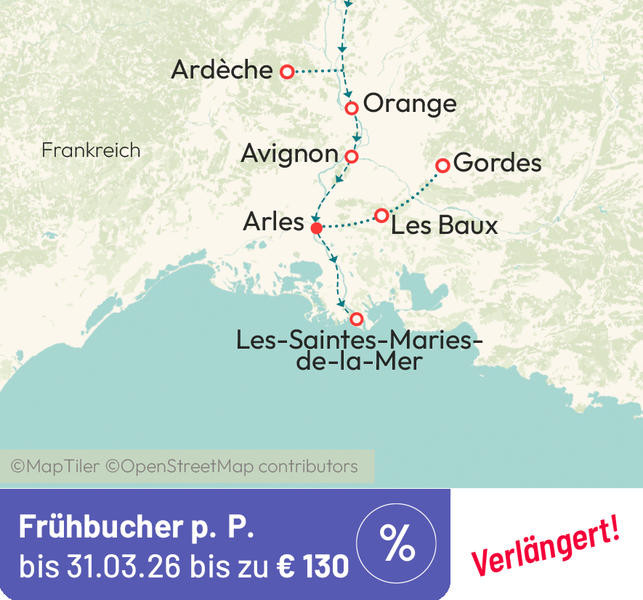 Die Provence und die Camargue laden zum Genießen ein: Kaum eine Region Frankreichs hat eine so vielfältige Landschaft zu bieten. Erleben Sie den Duft der Lavendelfelder, die malerischen Dörfer auf den Bergrücken der Alpilles, einsame Täler in der Vaucluse. Schon die Römer liebten das Leben in der Provence und hinterließen eine Fülle von Baudenkmälern. Im Mittelalter residierten Päpste in Avignon, siedelten Mönche in einsamen Tälern und die Adelsgeschlechter bauten stolze Burgen, die bis heute erhalten sind.