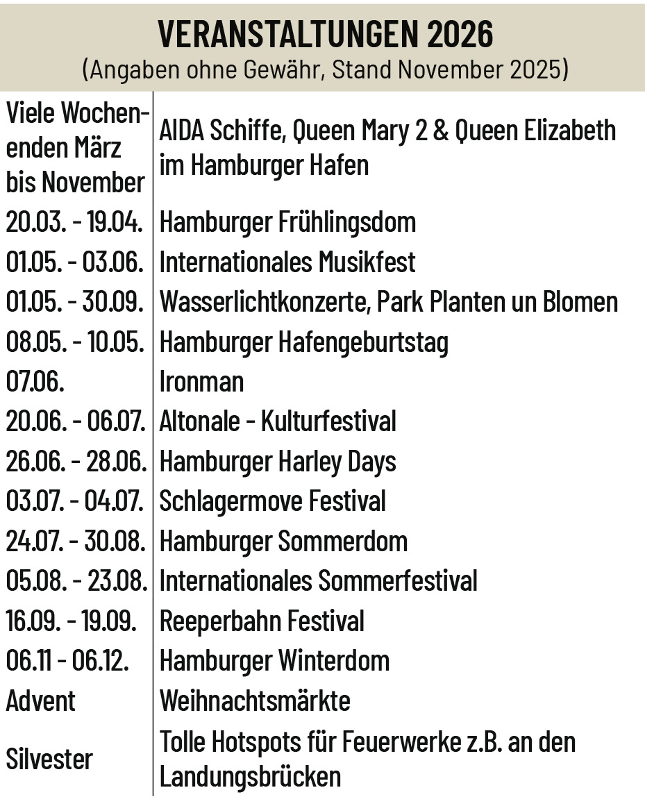 - Im Falle von Großveranstaltungen in Hamburg: Fischmarktbesuch entfällt, dafür Heimreise über das Alte Land.