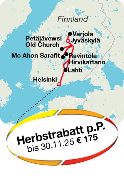 Petäjävesi Auch heute starten wir nach dem Frühstück und werden unsere Gastgeberstadt etwas besser kennenlernen. Auf den Spuren des wohl bekanntesten Bewohners, dem Architekten Alvar Aalto, lernen wir die Stadt mit ganz anderen Augen zu betrachten. Auch bei uns in NRW hat er seine Spuren hinterlassen, das Aalto-Theater in Essen. Nachmittags Weiterfahrt zum UNESCO-Weltkulturerbe der Kirche von Petäjävesi. Besichtigung und Führung durch die 360 Jahre alte Holzkirche.