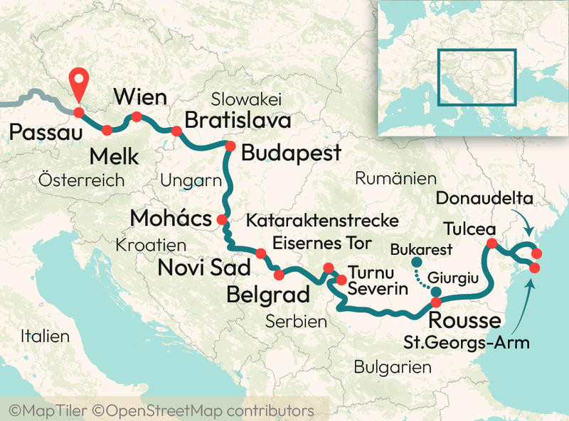 Die Donau ist mit ihren 2.857 Kilometern der zweitlängste Fluss Europas und zählt zu den spannendsten Flüssen der Welt. Großartige Landschaftspanoramen und faszinierende Metropolen reihen sich aneinander. Das mächtige Eiserne Tor und das UNESCO-Welterbe Donaudelta zählen zu den Highlights dieser Reise. Passau – Bratislava – Belgrad – Katarakten (Eisernes Tor) – Rousse – St. Georg Arm – Donaudelta – Tulcea – Bukarest – Turnu Severin – Eisernes Tor – Novi Sad – Budapest – Wien – Wachau – Passau
