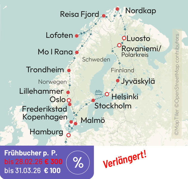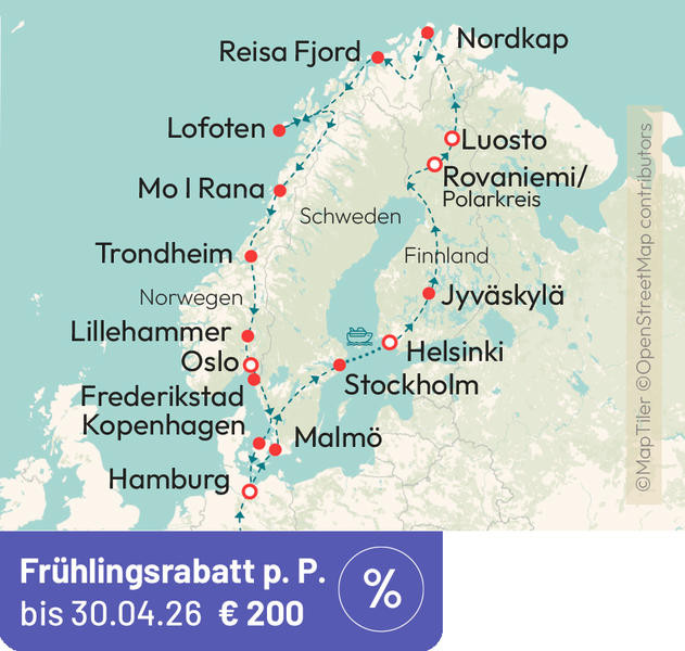 Eine Traumreise in den hohen Nordens Europa erwartet Sie auf unserer neuen Route zum Nordkap. Erleben Sie eine außergewöhnliche Kombination mit Bus und Schiff. Auf den schönsten Straßen Skandinaviens erreichen Sie das Nordkap und erleben die unberührte Wildnis von Lappland. Mit dem Schiff fahren Sie durch die zauberhaften Schären der Ostsee. Auf der atemberaubenden Küstenstraße erleben Sie mit den Fjorden und den Inseln der Lofoten die Highlights der norwegischen Küste. Die Perlen der Skandinavischen Hauptstädte Stockholm, Helsinki und Oslo erleben Sie auf Ihrer Entdeckerreise hautnah.