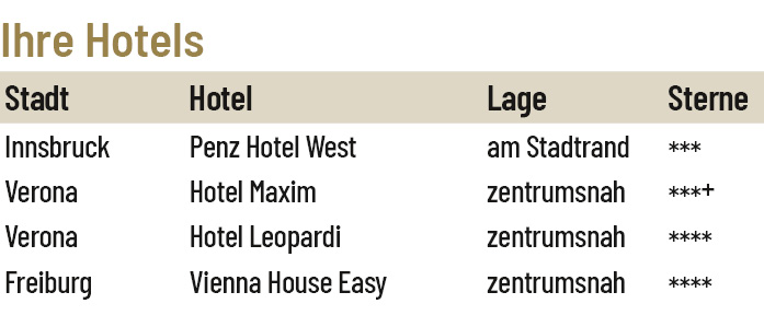 Hotel: Das komfortable Hotel, das Klassik mit Moderne kombiniert, liegt direkt an der Altstadt von Verona, ca. 2.200 m von der Arena entfernt. Adresse: Via Leopardi 16, 37138 Verona.