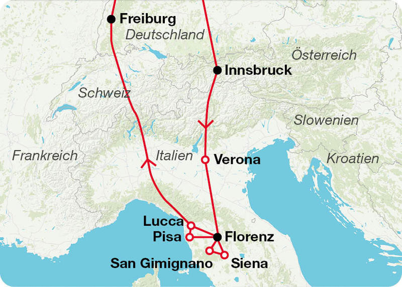 Die Toskana gilt als eine der großartigsten Kulturlandschaften Europas. Freuen Sie sich auf die Silhouetten und Farben eines fruchtbaren und hügeligen Bauernlandes mit Olivenbäumen, Zypressen und den sonnenverwöhnten Weinreben des Chiantis. Aber auch die prachtvollen Städte wie Florenz, Verona und Pisa werden Sie faszinieren.